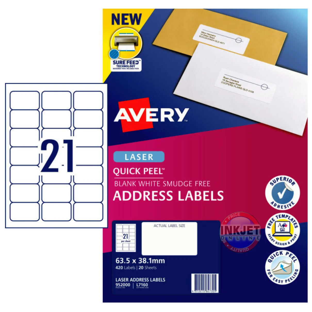 Print professional looking jam free labels from your laser printer. The Avery L7160 / 952000 address labels dry instantly after printing so you can place them straight on the envelope. And you can peel and apply them with ease using the unique Quick Peel Pop-up Edge.