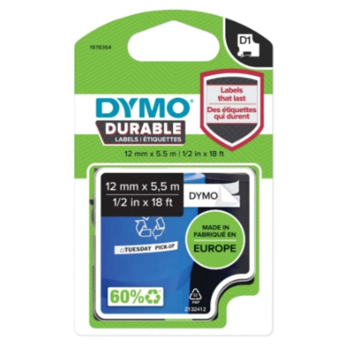 Dymo D1 Durable Tape 12mm Black on White Label Tape – 1978364
