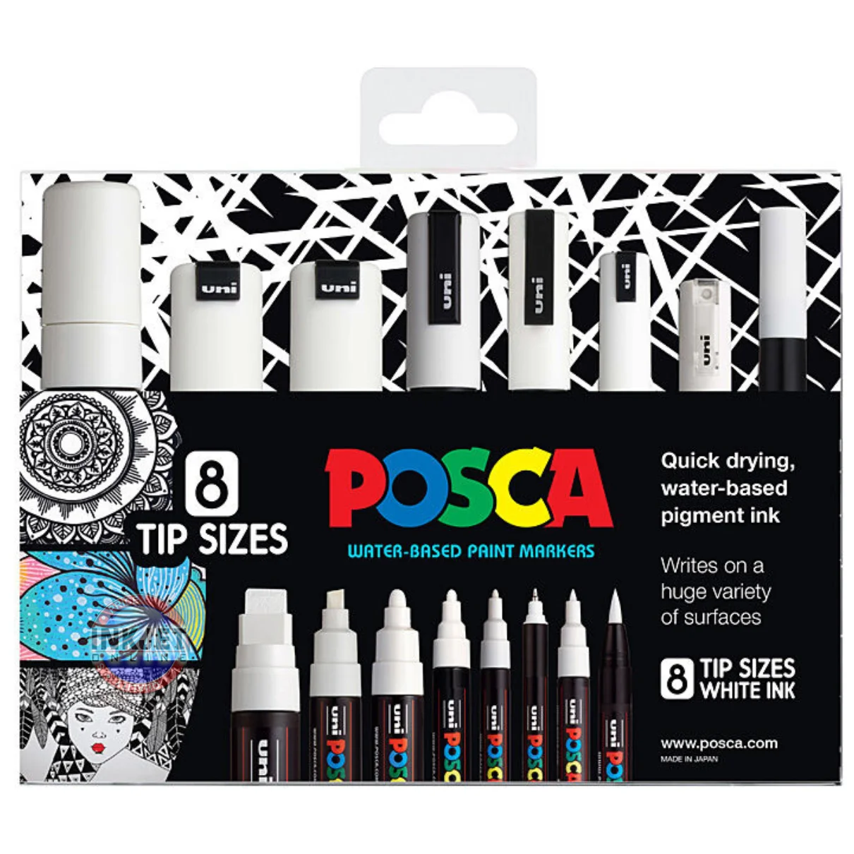 - Includes 8 white Posca paint markers in assorted tip sizes